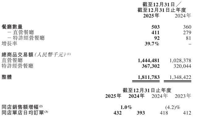 达成2025年12月31日,碰见小面餐厅数目为503家,其中,直营餐厅411家,稀薄方向餐厅92家。
